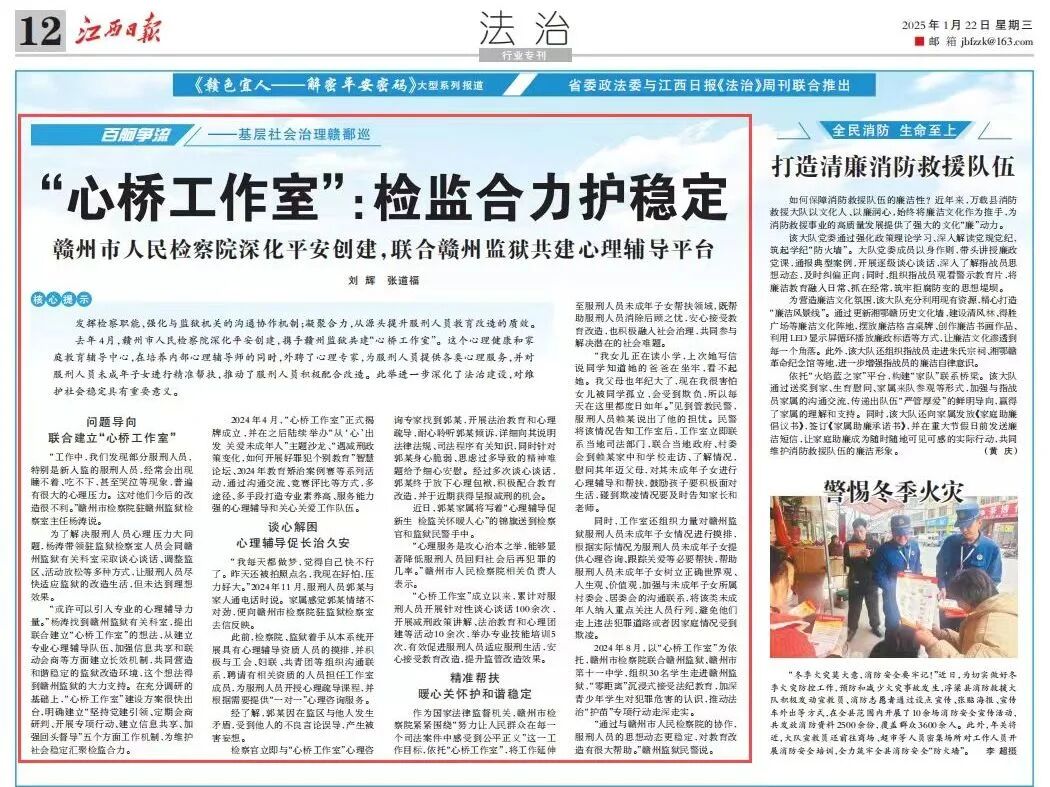 聚焦监管改造效果提升,联合赣州监狱共建“心理健康和家庭教育辅导中心”,通过培养内部心理辅导师与外聘心理咨询专家相结合的方式,针对狱内心理健康教育、未成年身心关爱帮扶、特殊群体法纪规章教育、检监干警服务能力提升四大模块协同发力,促成赣州市检察院、赣州监狱和赣州市第十一中学打造法治教育基地,“心桥工作室”驻赣州市第十一中学辅导站挂牌成立。