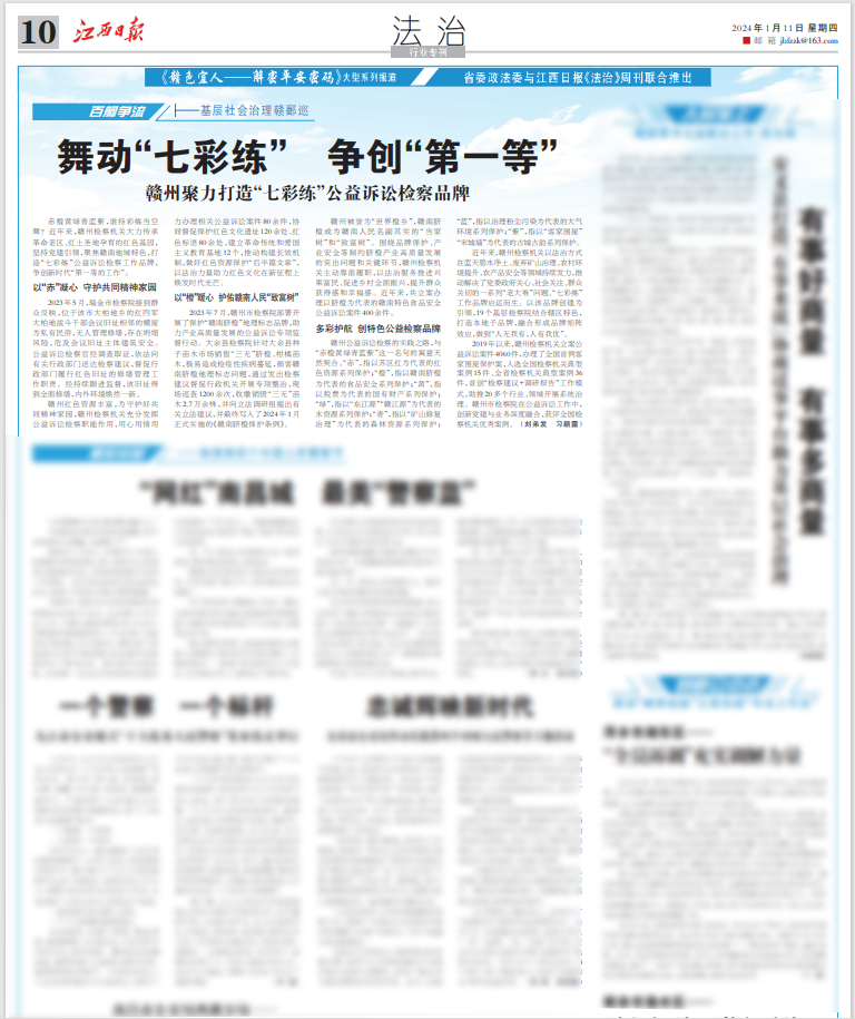 今天,江西日报刊发文章《舞动“七彩练” 争创“第一等” ——赣州聚力打造“七彩练”公益诉讼检察品牌》。全文如下: