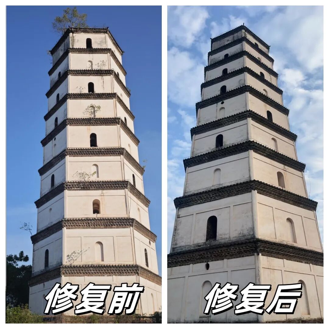 2024年12月,玉虹塔的修复工程正式启动。6名“蜘蛛人”登上古塔外部,借助悬挂的安全绳对生长在古塔上的杂树进行集中清理。经过数日连续作业,在古塔上生长了十余年的杂树终被彻底清除,塔身裂缝及松动的砖瓦也得到了填砌加固。当最后一截树根从塔顶拔出时,办案团队也亲眼见证了古塔往日的神采。这次“美容”,有力维护了玉虹塔的历史真实性、风貌完整性和文化延续性。